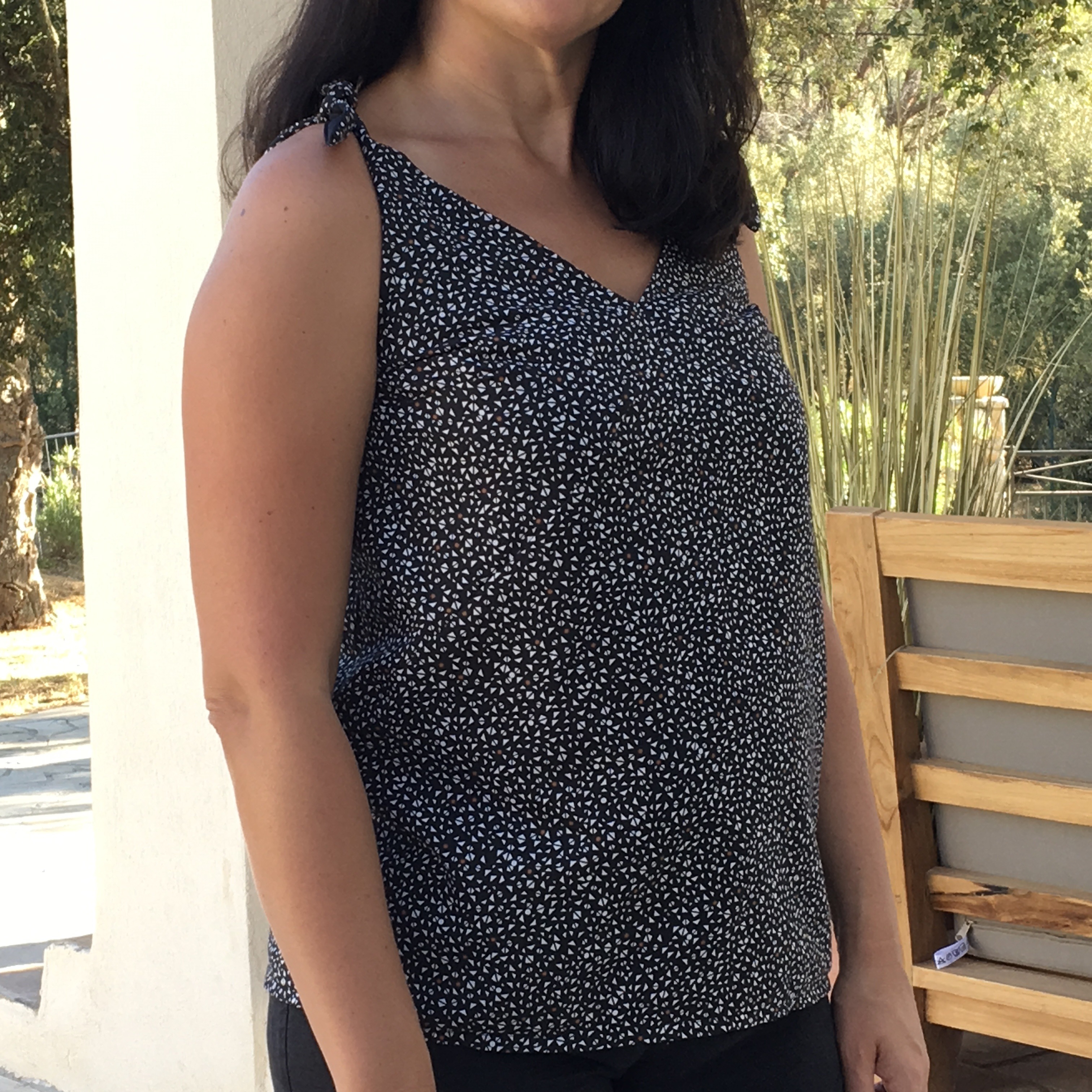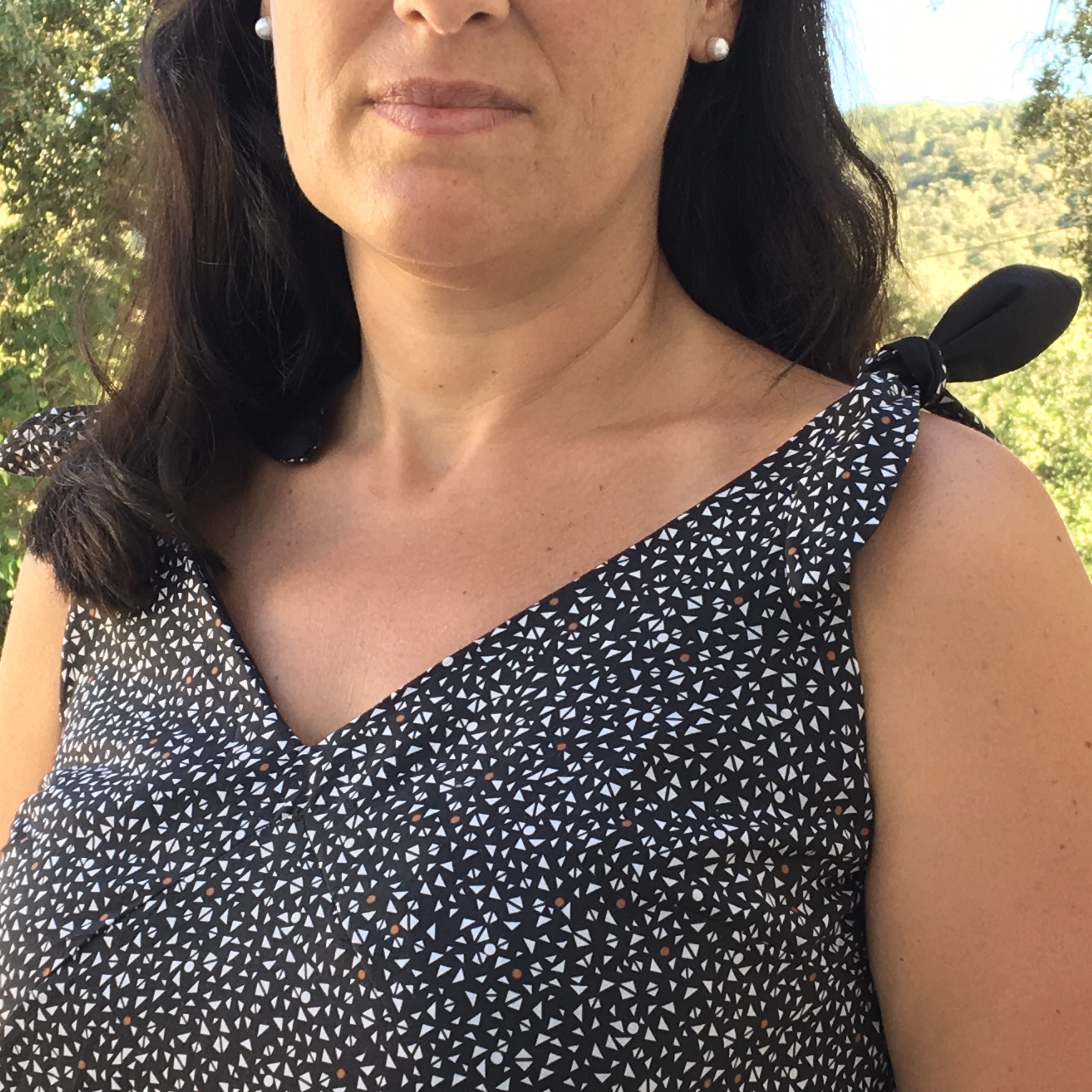 Il s’agit d’un petit top à empiècements en forme de triangles sur le devant et dans le dos et doublé. Le joli détail complémentaire sont les liens à nouer aux épaules.