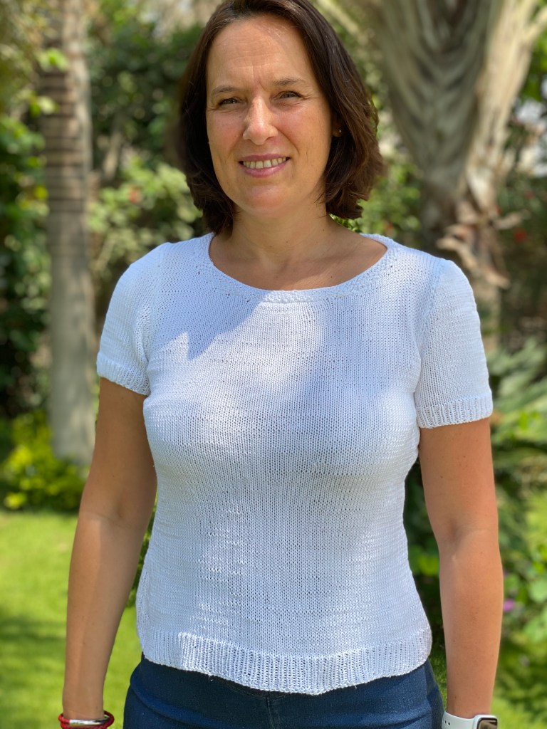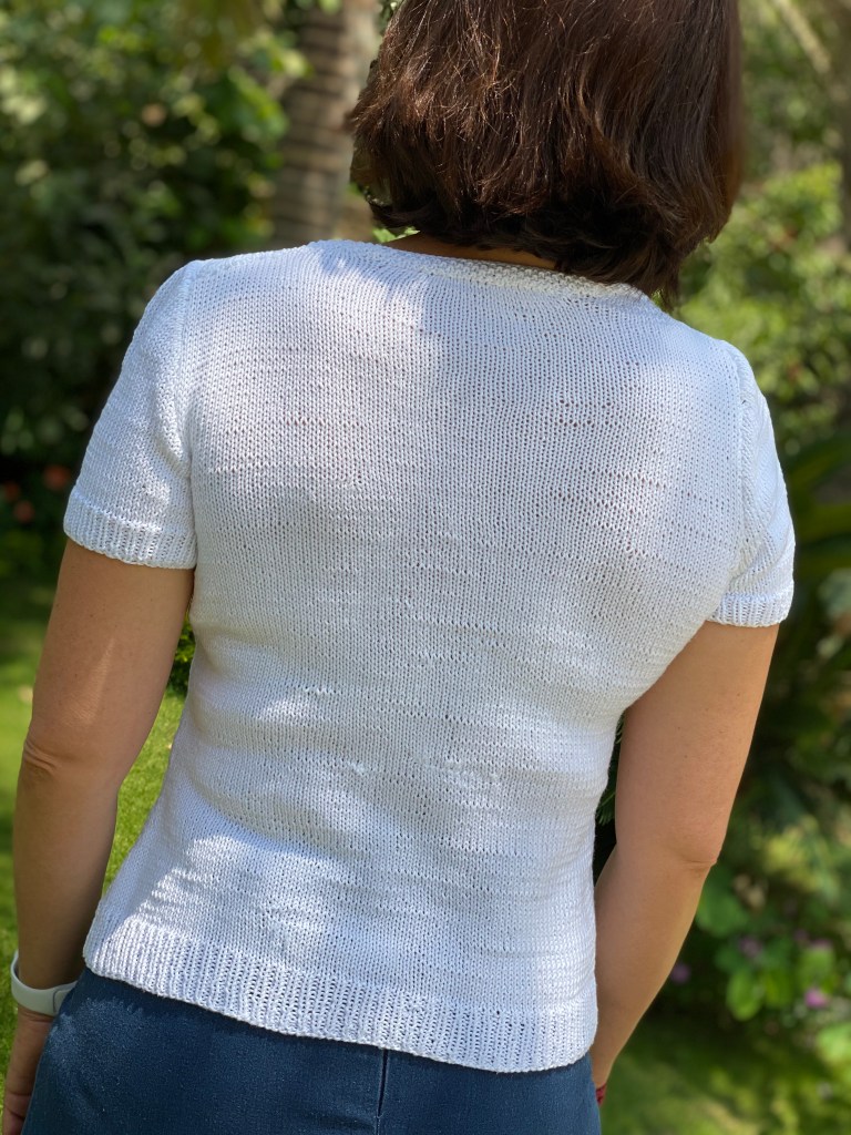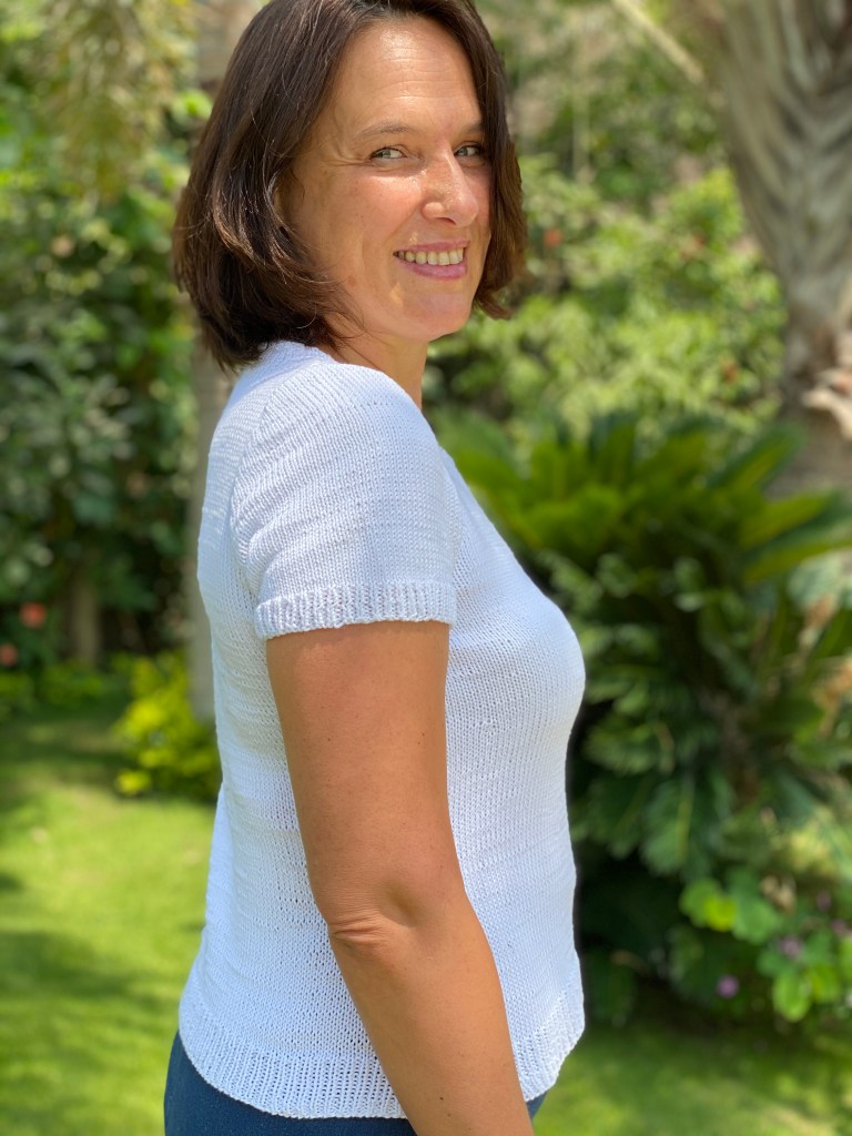 Le modèle que j’ai choisi est un modèle tout simple à col rond, des manches courtes, avec du point de riz au col (petite nouveauté pour moi) et des cotes 1/1.