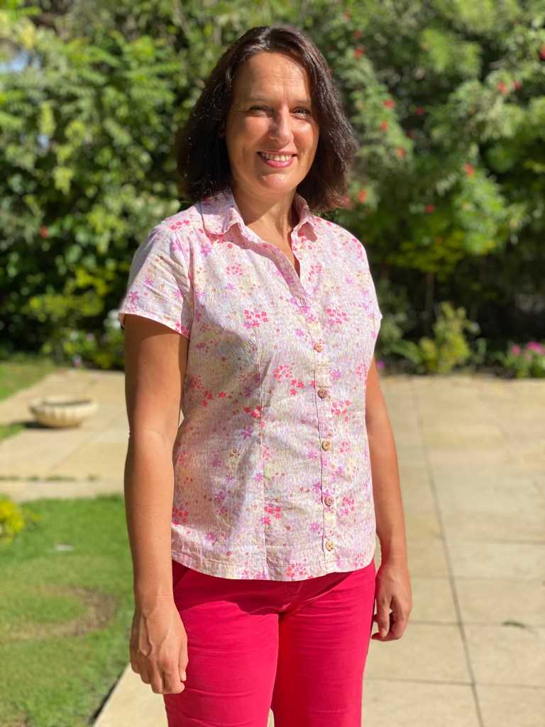 Ce chemisier estival, épousant bien les formes, est très réussi. Je suis une adepte des chemises ou chemisiers avec des pinces, le loose ne me va absolument pas, je ressemble à un stylo habillé! Pour la robe, ce n’est pas le même patron, je l’ai cousue aussi et elle est magnifique, je te la conseille.
