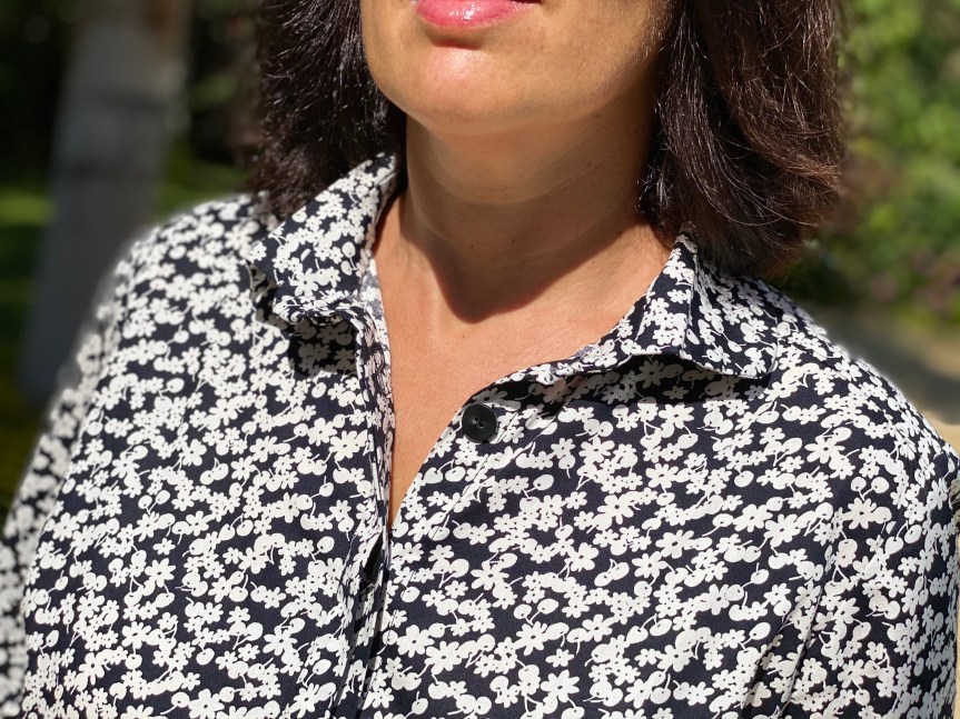 2. J’aime beaucoup les tissus à petites fleurs, pas besoin de raccords et avec un bas uni, la tenue est parfaite. Il me semble que ce chemisier avait des volants sur le modèle mais je préfère sans, il est plus facilement portable ainsi.