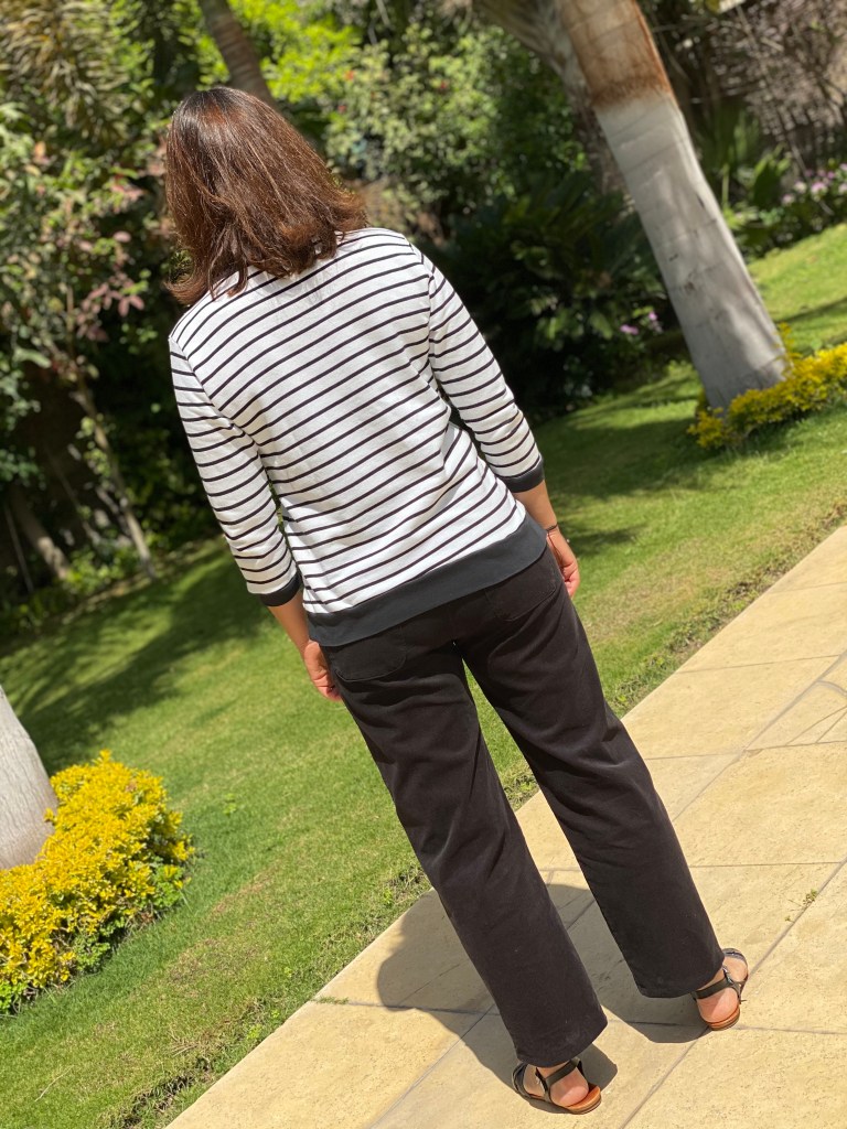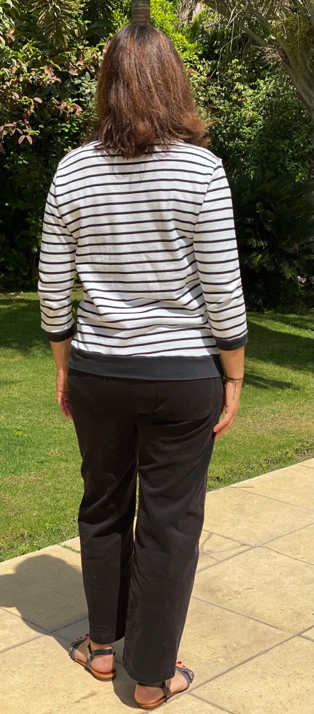Sur ces photos, je porte mon pantalon avec un sweat I’am Apollon de I’am patterns. Il me restait une chute de ce jersey à rayures noires et une chute de bord cote noir. J’ai cumulé les deux et voici le résultat. Vous comprendrez donc que si les manches sont 3/4 c’est bien parce qu’il ne me restait plus assez de matière. Petit à petit j’arrive à éliminer les chutes, à trouver des solutions pour en avoir le moins possible.