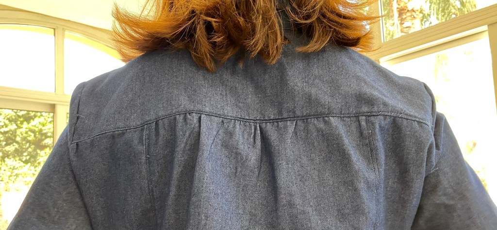Par exemple et à moins d’avoir tout compris de travers, pour le col, il fallait repasser les valeurs de couture vers l’intérieur, et coudre une fois que les pièces avaient leur forme définitive.
