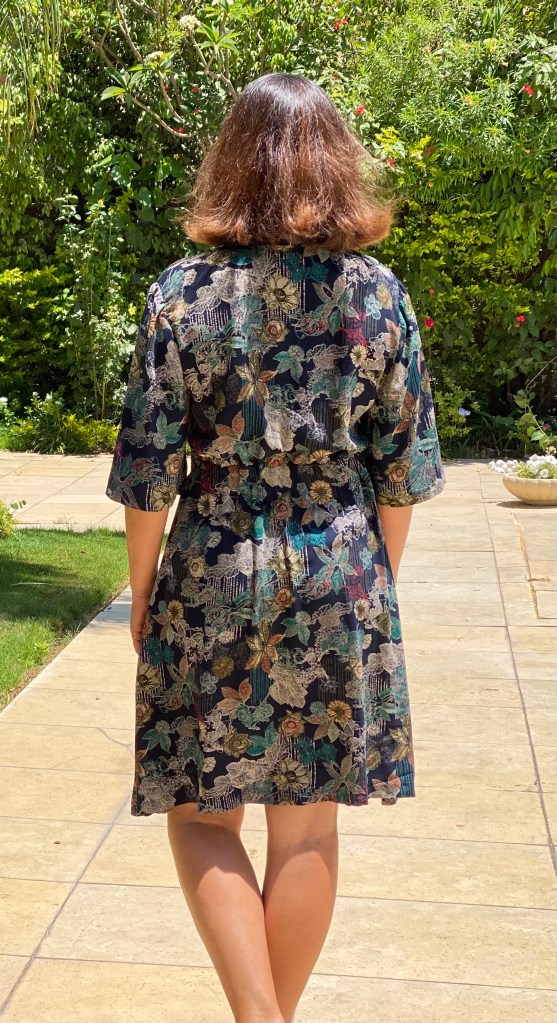 J’ai enlevé 16 centimètres sur le bas de la jupe devant et dos. Quand je suis arrivée ici, j’ai cousu des jupes et des robes longues afin de couvrir totalement mes jambes, mais et meme si je n’ai pas des jambes de mannequin, ce n’est pas la longueur que je préfère et de fait il y a dans mon armoire des pièces cousues au debut de l’expatriation que j’ai beaucoup porté au début et après 2 ans ici, j’avoue avoir envie de faire moins d’efforts. Donc si je dois couvrir mes jambes, je porte un pantalon, si je me couds une robe que je porterais un peu ici et beaucoup plus en France je coupe la longueur que j’aime.