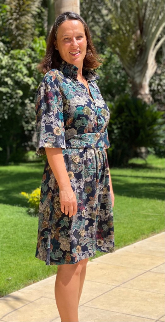 Il s’agit de la robe Emma de Clematisse pattern. C’est une robe marquée à la taille par une ceinture, élastiquée au dos pour un confort absolu. Elle a un joli col montant volanté. Elle est boutonné du col à la ceinture.