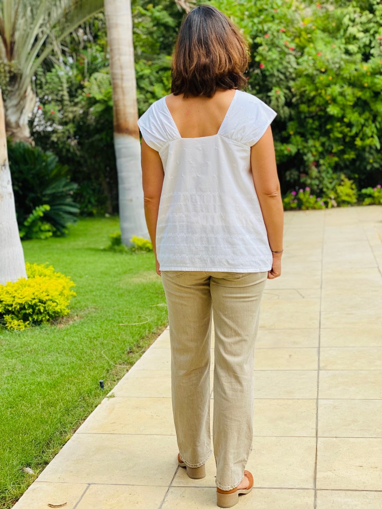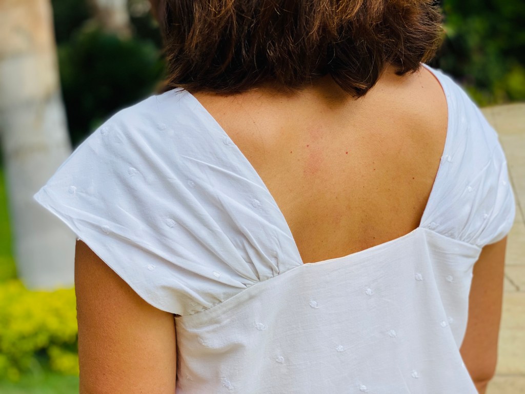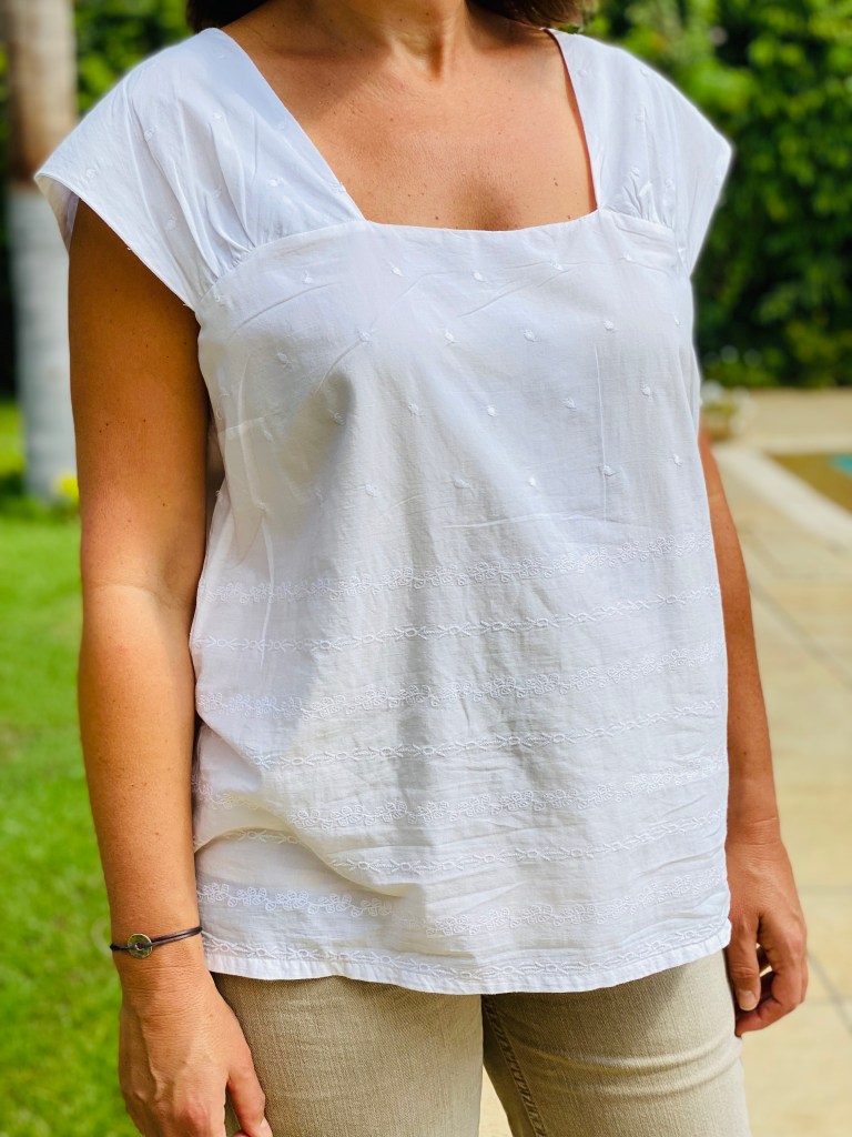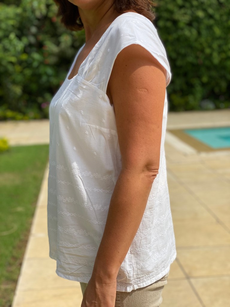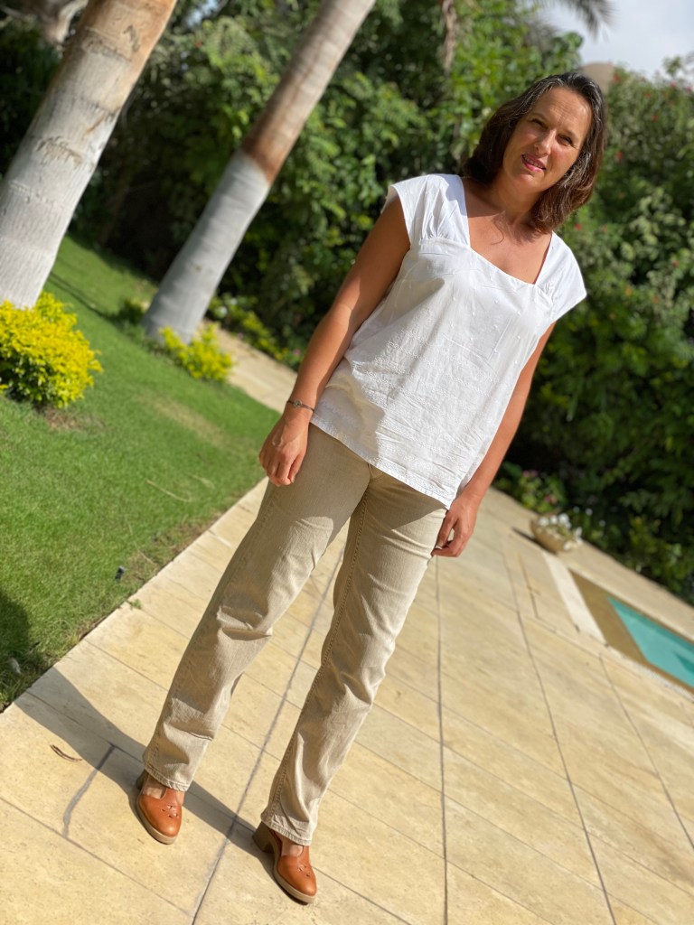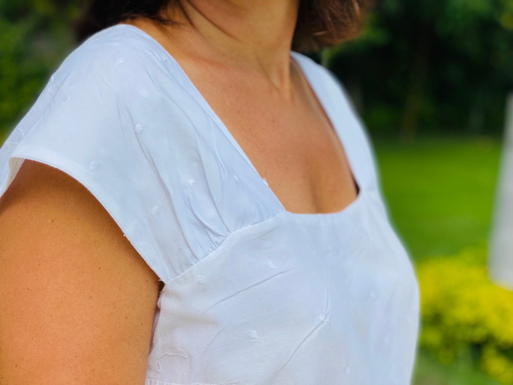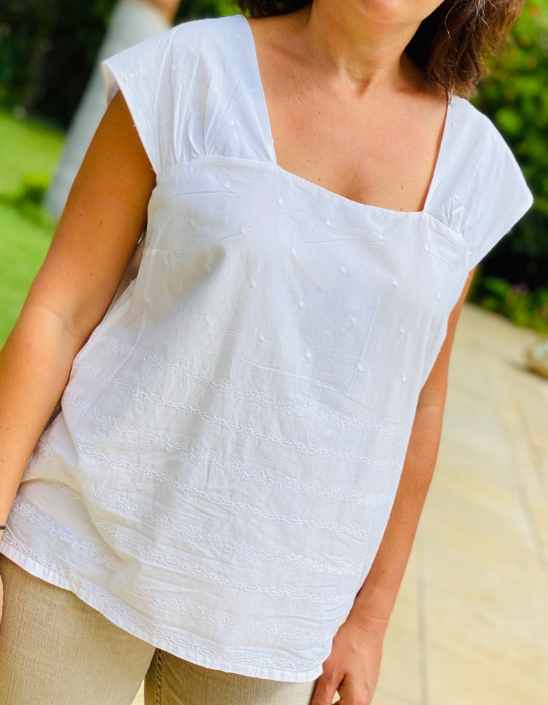 J’aime beaucoup l’encolure devant et dos parfaite pour l’été mais cette version est selon moi trop grande, j’aurai voulu quelque chose d’un peu plus ajusté. La prochaine sera cousue en taille 40.
