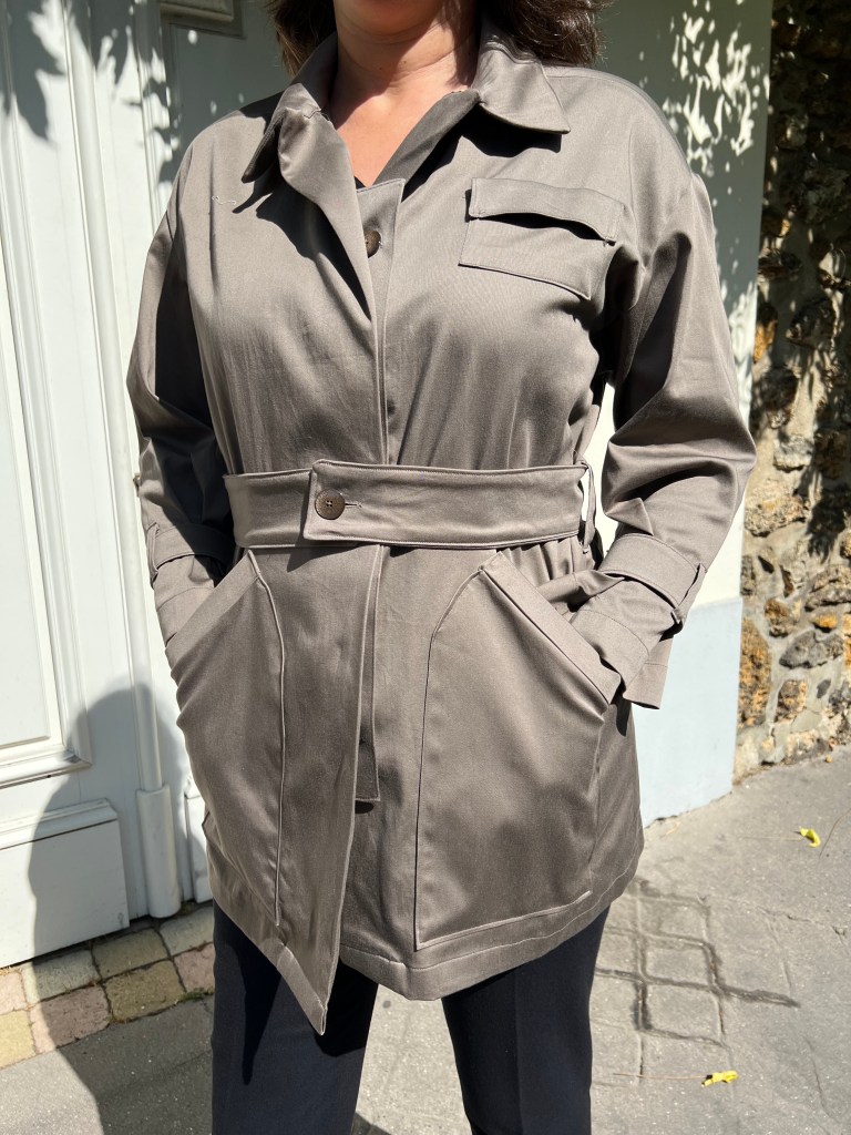 Il s’agit d’une saharienne, non doublée avec 3 poches et une ceinture. La patte de boutonnage est cachée. La ceinture permet de cintrer cette veste qui à la base est ample. C’est pourquoi j’ai fait des photos avec la veste fermée et avec la veste ouverte pour que vous vous rendiez compte du résultat.